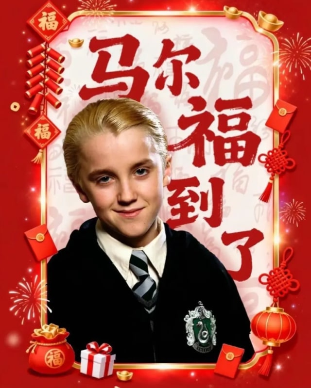 By now, the original lucky decorations have been picked up by international media, and Tom Felton, the actor who plays Malfoy in the movies, is now also more than aware that he became the most unexpected mascot of the Chinese New Year , as he himself reposted an image that highlighted his new status.