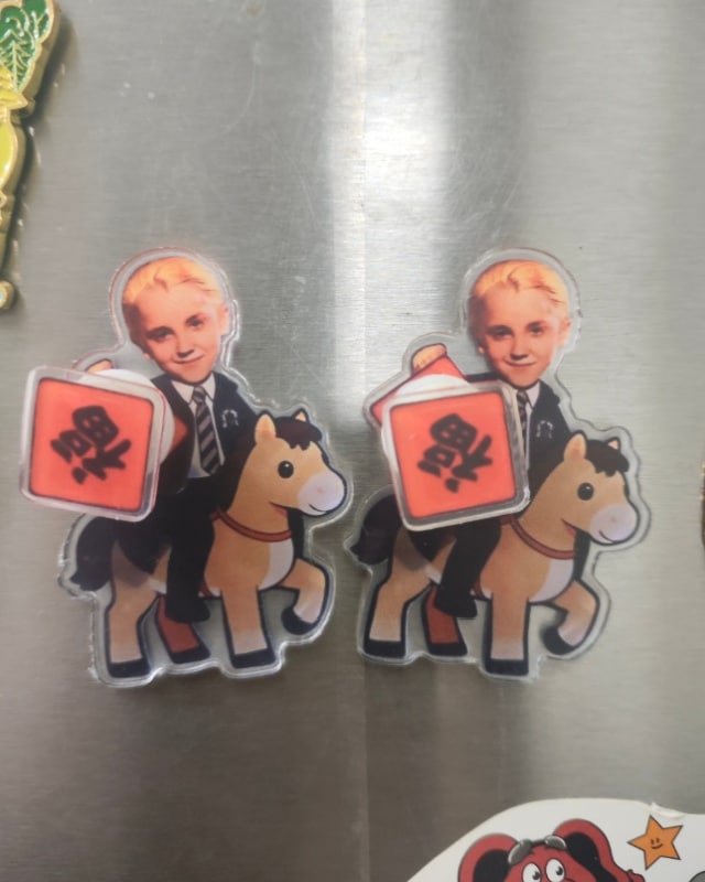 Malfoy in Chinese is phonetically rendered as Mǎ’ěrfú (马尔福), containing the characters 马 meaning “horse” and 福 meaning “luck” or “good fortune.” With Malfoy’s name thus associated with good luck in the new year, decorations featuring his face have shown up on front door banners and fridge magnets.