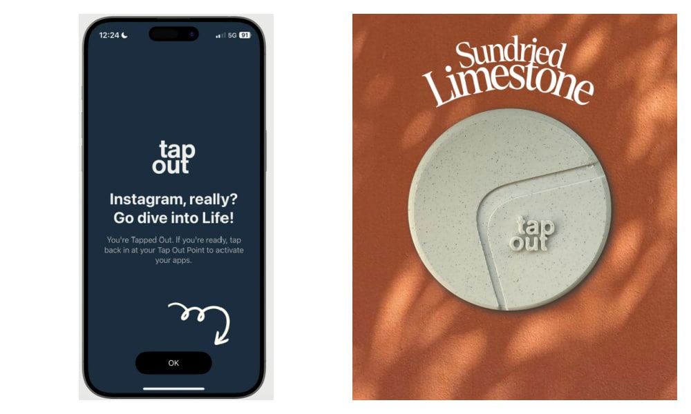Lately, this became a topic of discussion in a digital group chat I share with my friends in Amsterdam. They found a practical way to distance themselves from the feeds on their phones: the Tap Out, an app blocker designed by two Dutch guys that only lets them access distracting apps by physically tapping a small “Tap Out Point,” a compact NFC-enabled puck available in different colors with fancy names like Sundried Limestone and Marbled Moon. By placing the puck in another room, or even leaving it at home while at work, a physical barrier prevents them from getting trapped in mindless doomscrolling and addictive swiping habits.