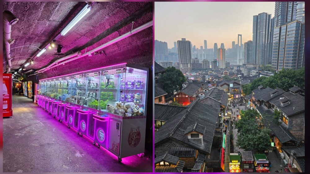 Photos by me: View over Chongqing’s Shibati area, and toymachines in a wartime bomb shelter near Libazi.
