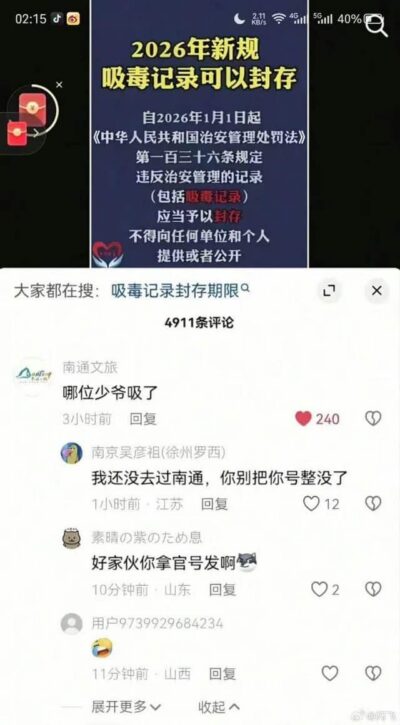 Under a social media post about this issue, the official account of Nantong’s Culture & Tourism Bureau replied: “Which young master was caught using [drugs]?”(“哪位少爷吸了”), jokingly suggesting that the law has been introduced to protect certain individuals from powerful families.