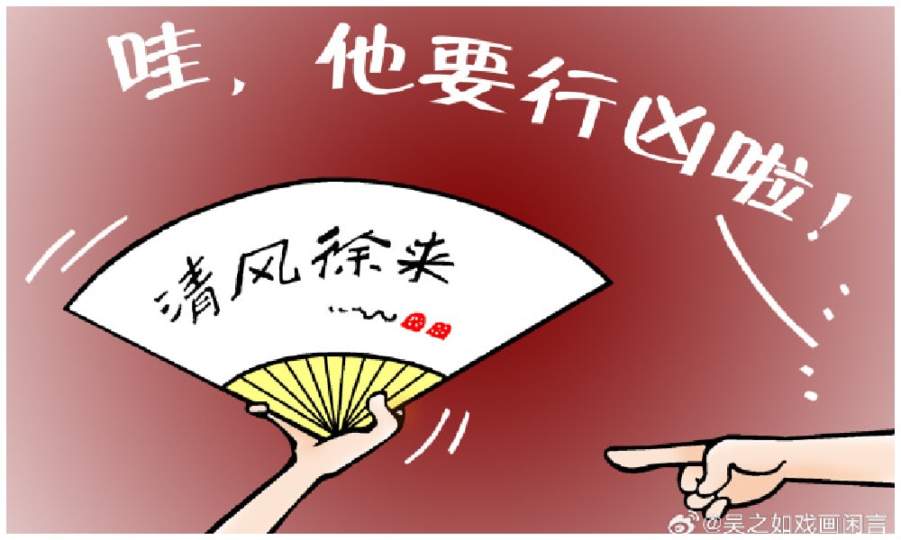 But others claim the exact opposite is true. Illustrator and commentator ‘Wu Zhiru’ (吴之如), former editor at Zhenjiang Daily, saw the incident as an example of toxic herd mentality. He posted an illustration of a fan being held up with the characters 清风徐来 (qīng fēng xú lái, “a cool breeze slowly blows”), an idiom to describe a pleasant atmosphere. A finger from the right points at the fan-holder, saying “Look, he’s gonna commit violence!” (“哇,他要行凶啦!”)