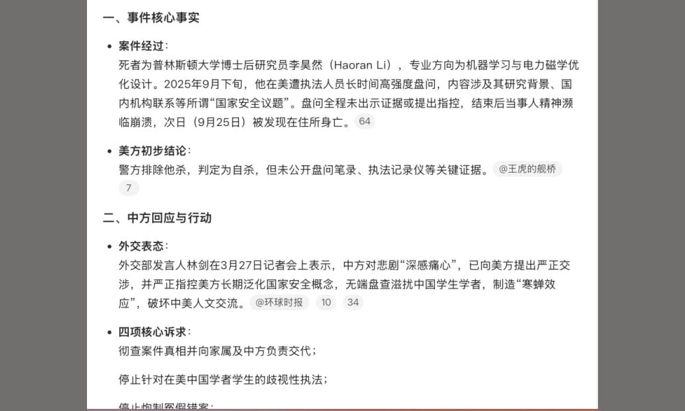 🔍 Given the lack of details, Weibo’s own AI chatbot attributed the incident to the death of Li Haoran (李昊然). Li was a postdoctoral researcher at Princeton University who died at home in September 2025. On February 13, 2026, his death was officially ruled a suicide. Since this case predated the current report and has never been linked to law enforcement questioning, this appeared to be a hallucination error by the Weibo chatbot.