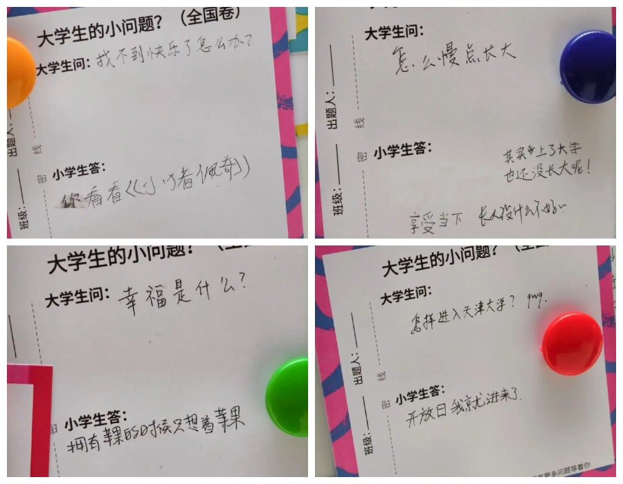 A Q&A message board at Tianjin University Library (天津大学图书馆) went viral after primary school children visiting the campus answered questions left by university students. Some exchanges: